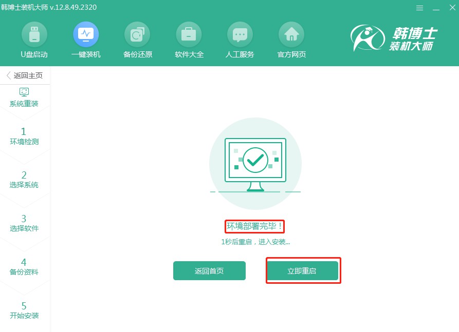 1.你需要先下載“韓博士裝機大師”,將它保存到桌面,雙擊圖標打開后,點擊主界面上的“開始重裝”按鈕。