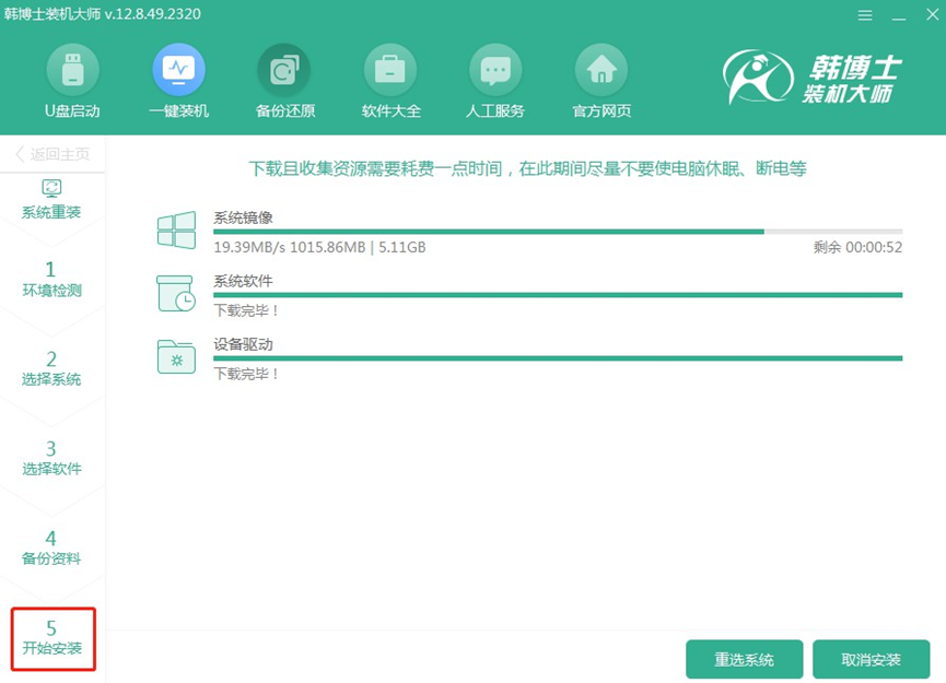 1.打開韓博士官網(wǎng),下載裝機(jī)大師安裝程序,完成安裝后啟動(dòng)軟件,在界面上選擇“開始重裝”,然后按照提示操作。