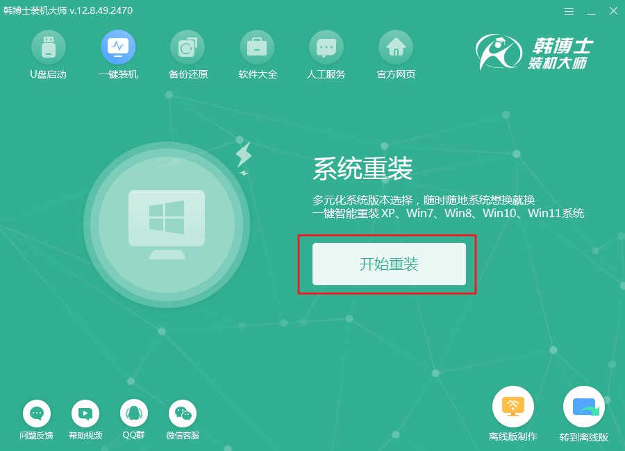 1.啟動韓博士裝機大師,直接選擇屏幕上的“開始重裝”按鈕,按照引導開始系統重裝過程。
