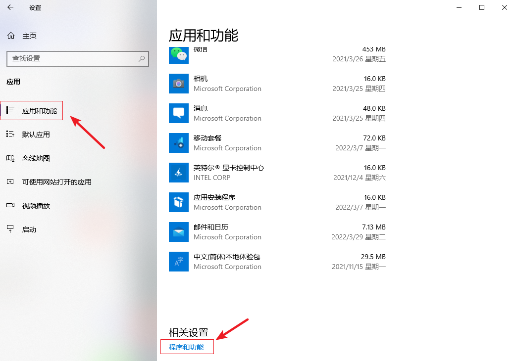 2.進入后,在左側選擇【應用和功能】,然后在右側下拉找到【程序和功能】。