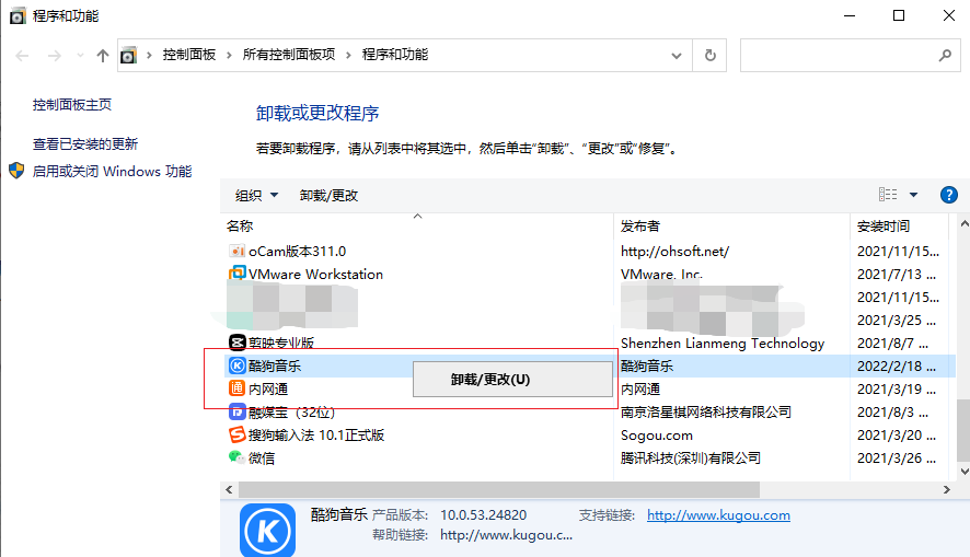 3.然后找到需要卸載的應用程序,右鍵選擇【卸載/更改】即可。