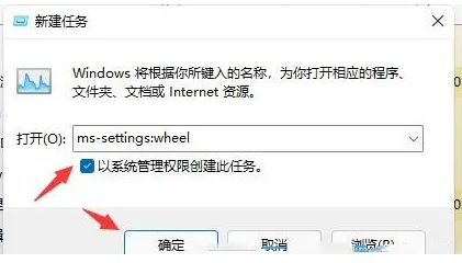 2.在彈出的窗口輸入:ms-settings:wheel,勾選“以系統管理權限創建此任務”,然后點擊“確定”。