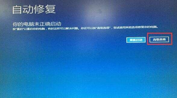 1.按電腦重啟鍵重新啟動計算機,重復這個操作三次以上,電腦出現自動修復界面,選擇“高級選項”。
