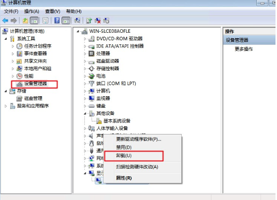 3.進入“管理”界面,依次點擊“設備管理器”-“顯示適配器”,右擊“顯卡驅動”選擇“卸載”。最后勾選“刪除此設備的驅動程序軟件”,按確定鍵。