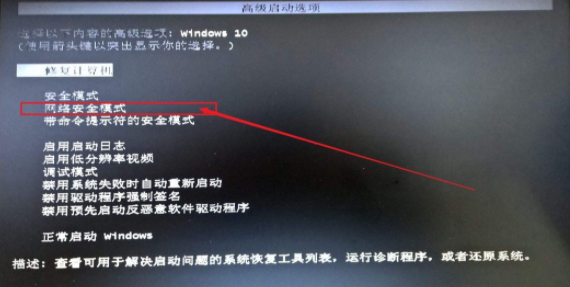 1.強制重啟電腦,并按F8鍵進入高級啟動選項。點擊選擇“網(wǎng)絡安全模式”,回車進入。
