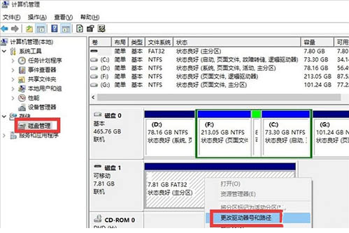 1.右擊選擇“管理”,進入后,選擇左側的“磁盤管理”,在右側右擊可移動硬盤,選擇“更改驅動器和盤符”。
