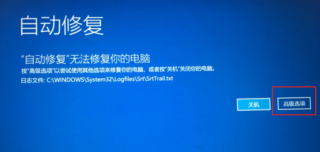 1.強制重啟電腦多次,直到電腦出現自動修復界面,然后點擊“高級選項”