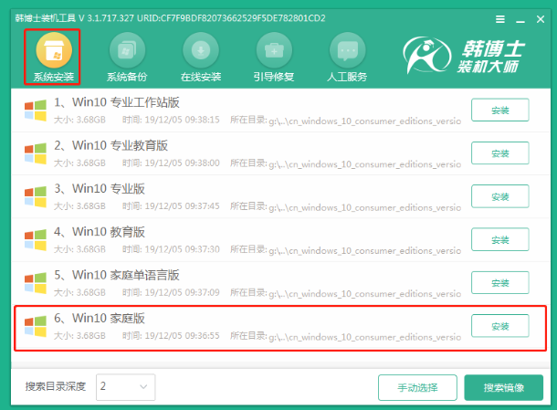 2.進入系統后,韓博士會自動打開搜索系統鏡像,找到鏡像,點擊安裝。